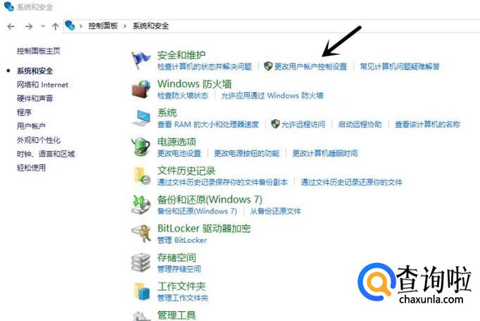 然后在系统和安全 界面找到 安全与维护 ,并且点击其中的 更改用户账户控制设置