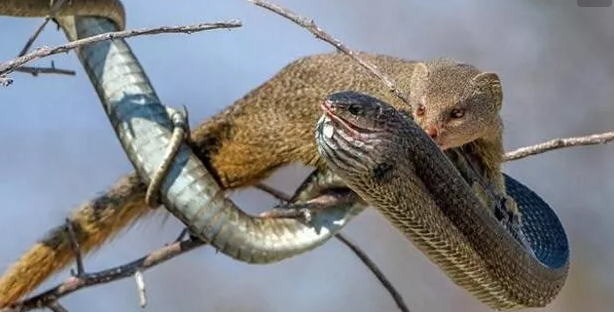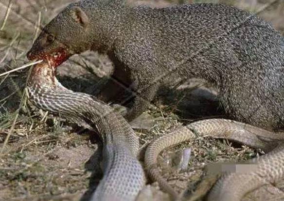 原来蛇獴有一种免毒性(化学解释是因为其血液的缓冲能力较强,能够抵御毒液的影响),眼镜蛇的毒性再大,对它一点作用也不起。有人做过试验:把蛇獴和眼镜蛇放在一起,开始时蛇獴全身的毛竖起来,眼镜蛇盯着蛇獴不敢乱动。蛇獴见蛇伏着不动,便向前去逗弄它。眼镜蛇发怒了,前半身竖起来,颈部膨大,发出“呼呼”的声音,一次一次地把头伸向蛇獴,想把蛇獴咬住。蛇獴很灵活,躲得很快,眼镜蛇总是咬不着它。等到眼镜蛇筋疲力尽,蛇獴才摸到它的身后,出其不意地一口咬住它的脖子,把它咬死,吃了它的肉。