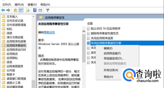我们右击“关闭应用程序兼容性引擎”选项,然后在弹出的对话框中选择“编辑”