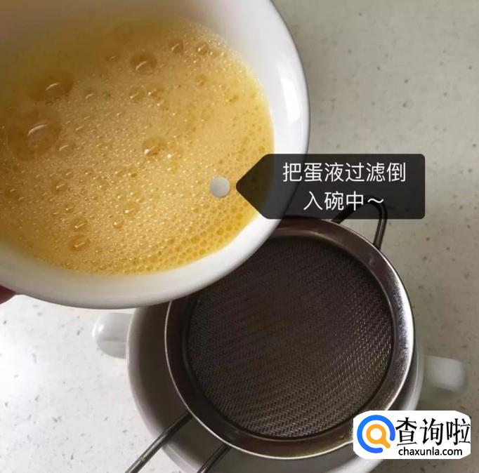 然后把蛋液过滤到干贝的碗中,如下图所示。小贴士:蛋液过滤后能够保证蒸出来的蒸蛋口感会更好。