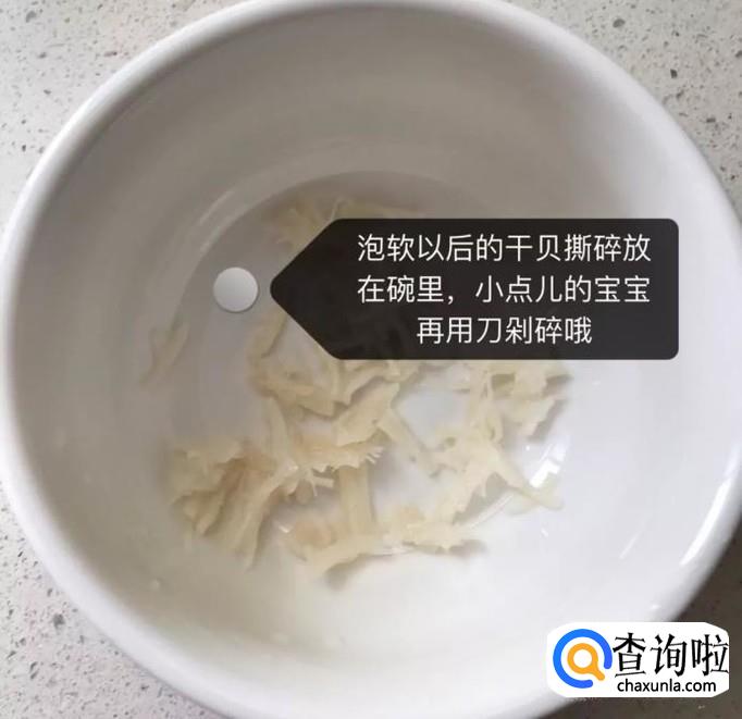 然后将泡软以后的干贝撕碎放入碗中,如下图所示。