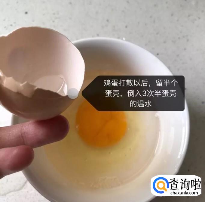 接着在另外一个碗中打入一颗鸡蛋,之后加入1.5倍鸡蛋量的清水,搅拌均匀,如下图所示。