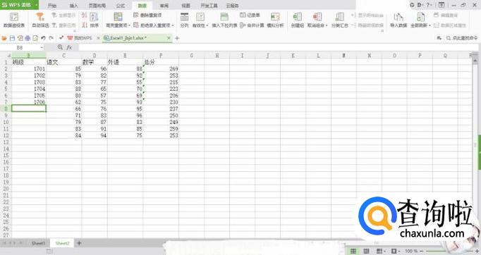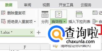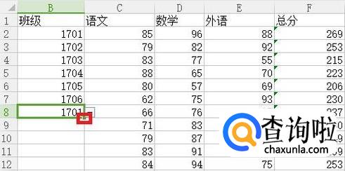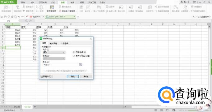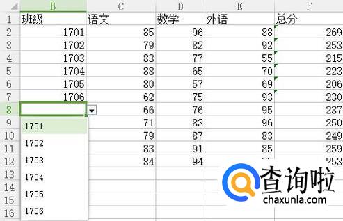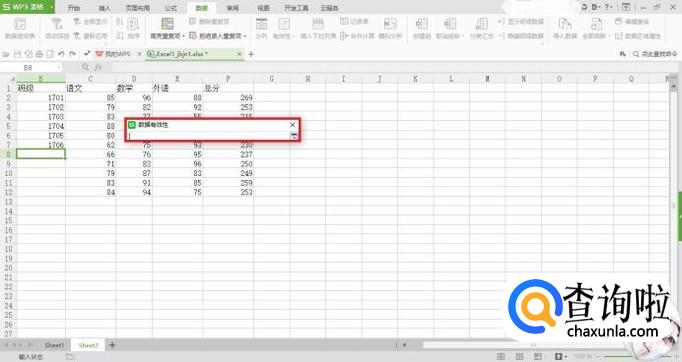 在“班级”一列的最下面,选中一个单元格,然后点击菜单栏中的“数据”选项卡,在该选项卡下点击两次“有效性”