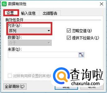 在弹出的数据有效性对话框中,设置“允许”的属性为“序列”。然后点击“来源”,如图所示