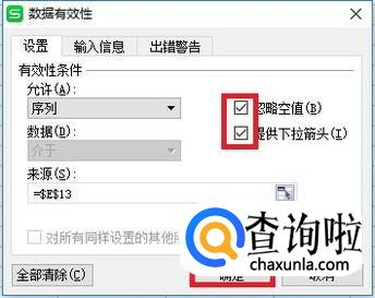 在数据有效性的对话框中,勾选 “忽略空值”“提供下拉箭头”点击“确定”