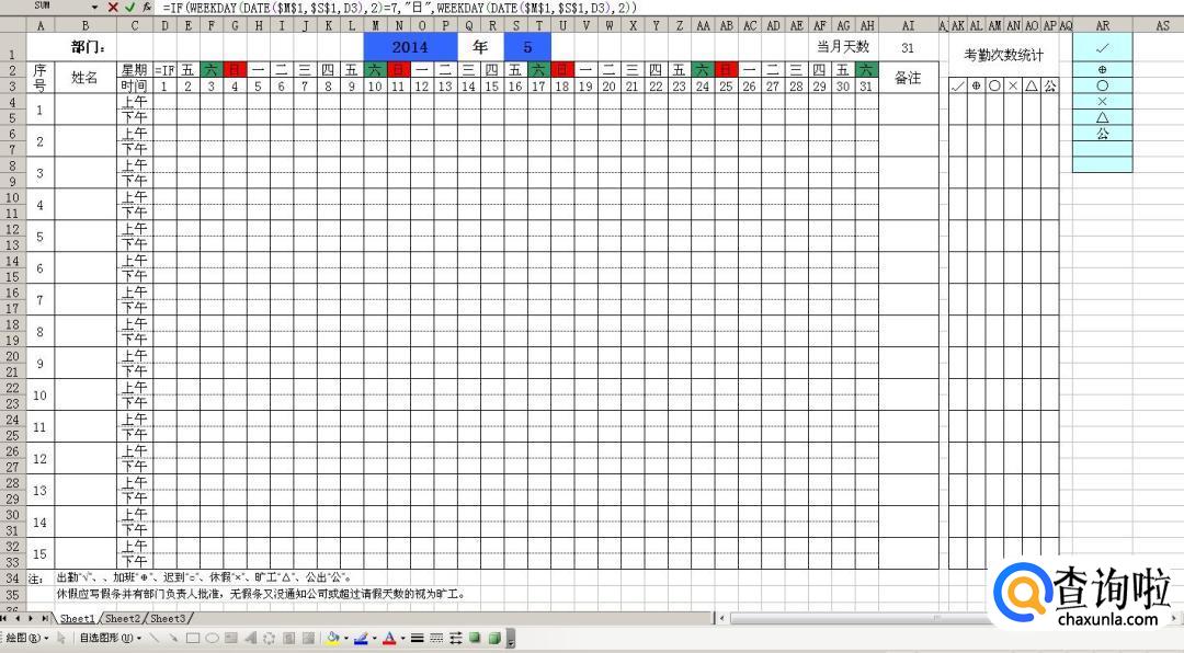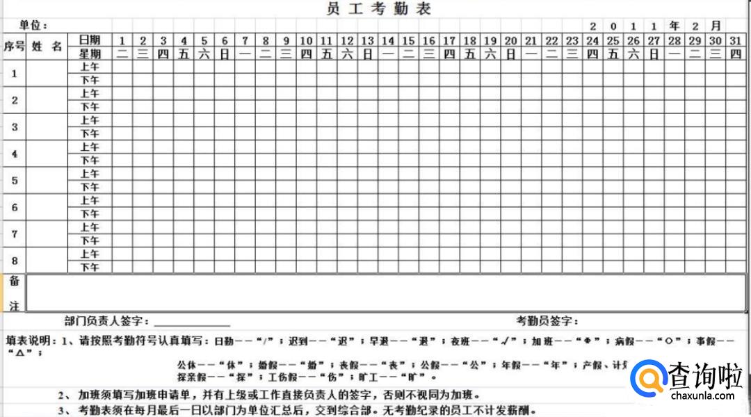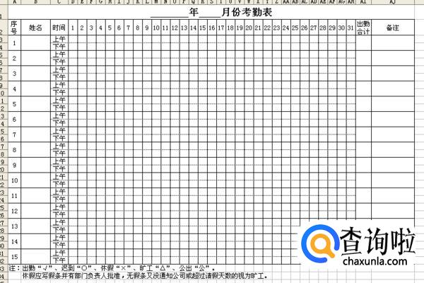 考勤时间要包含上午和下午,每天都要对实际情况进行标记。