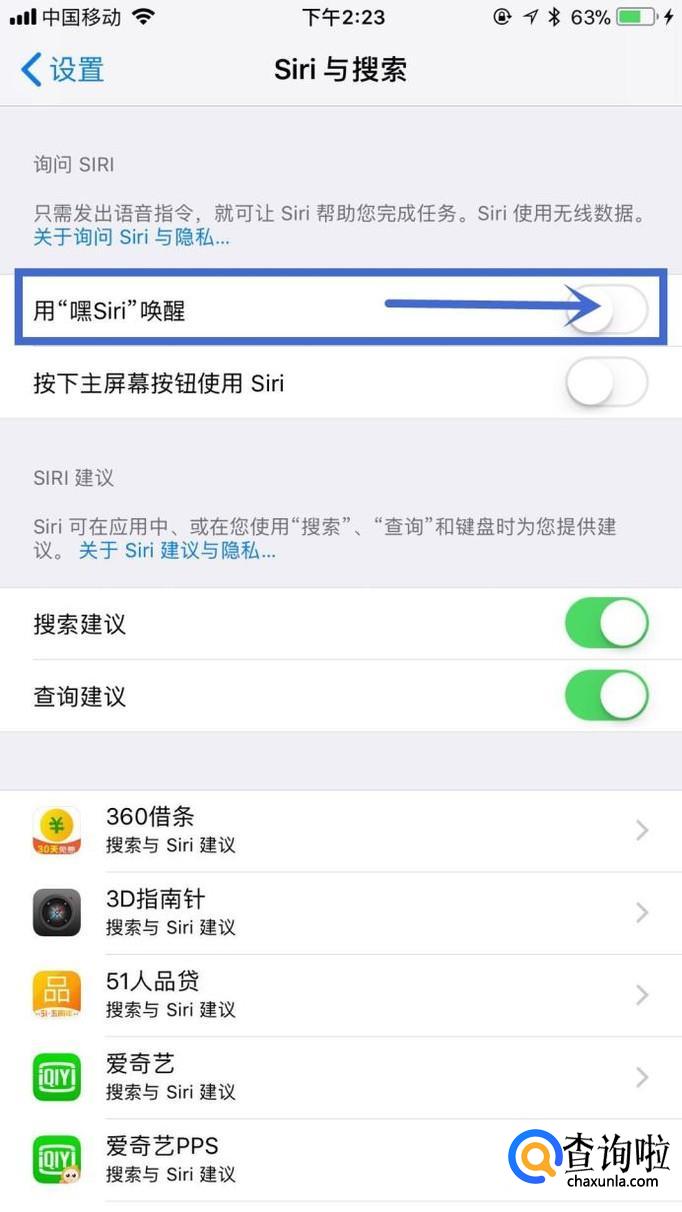 接着点击开启用“嘿siri唤醒”右侧的开关,如下图所示。