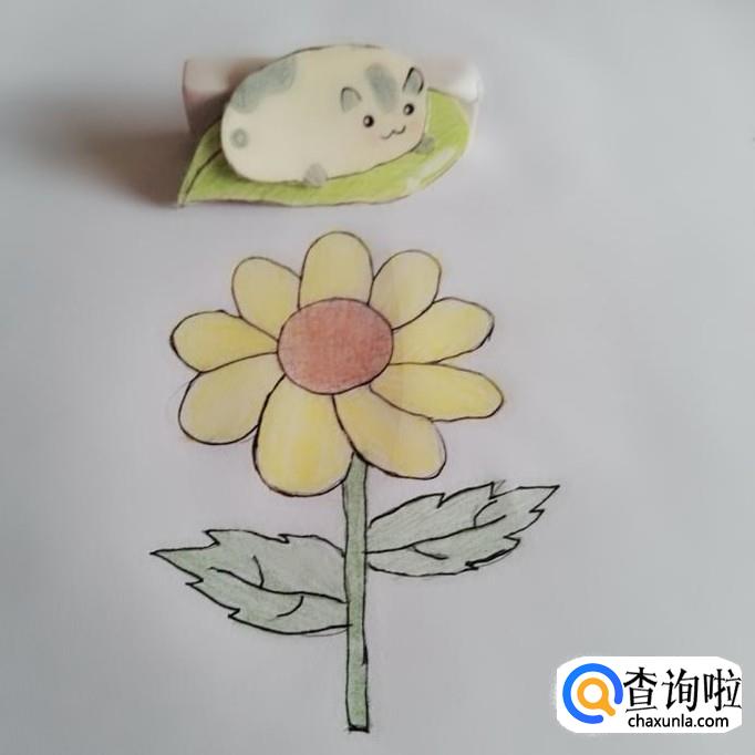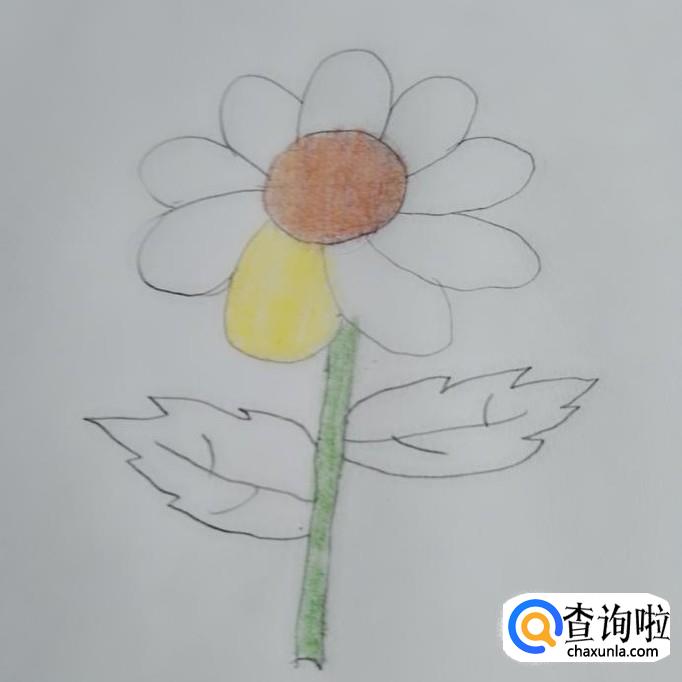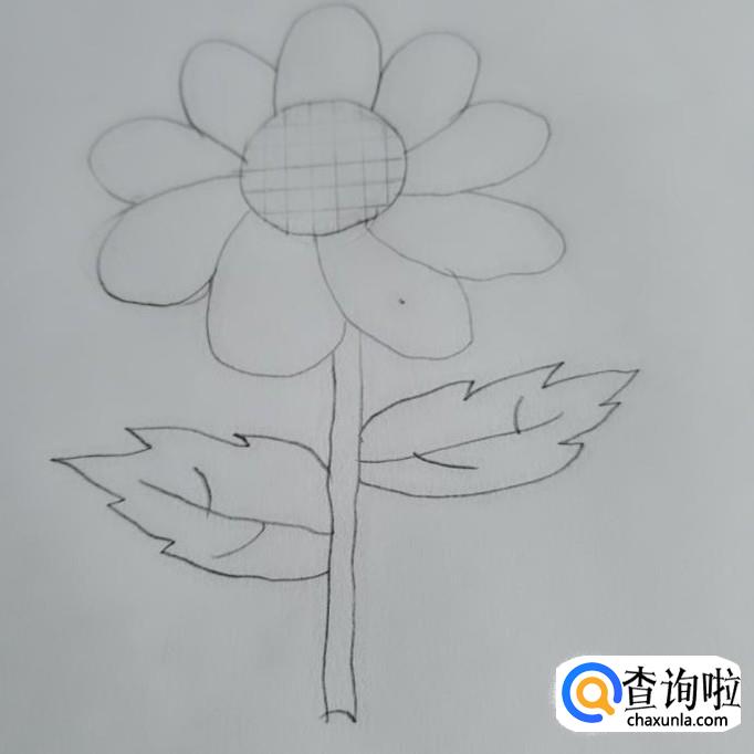 再画向日葵的杆和叶子,一般画二片叶子就好。如图所示。