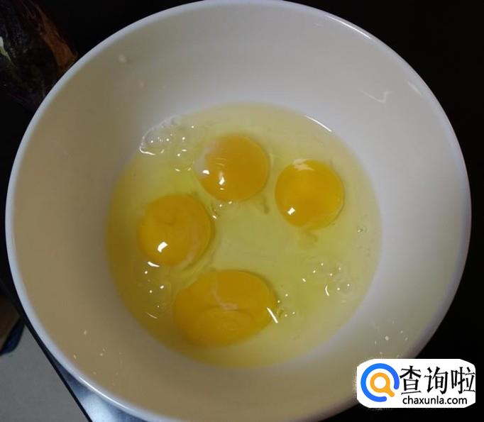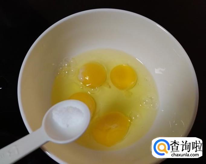 鸡蛋4个,打到碗里,加入1克盐,千万不要多加,否则后面吃起来会很咸,用筷子或者打蛋器将鸡蛋打匀;