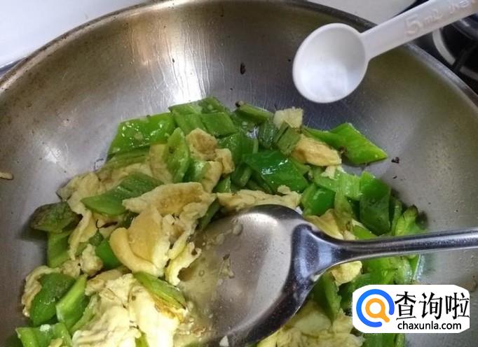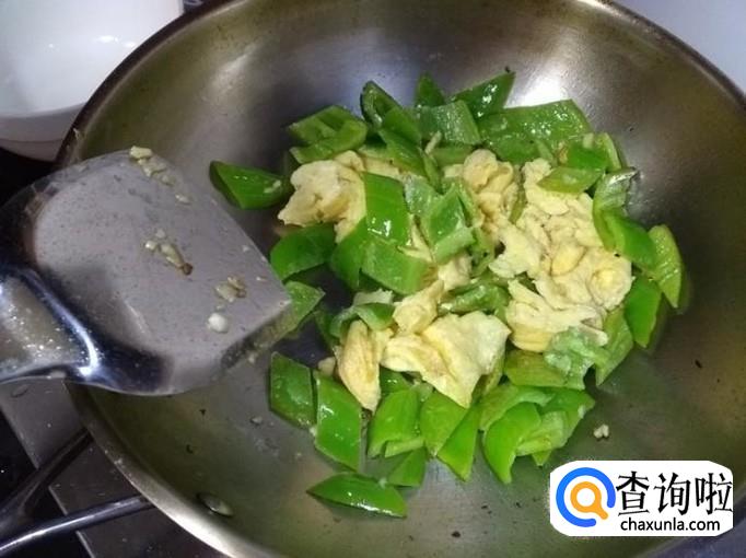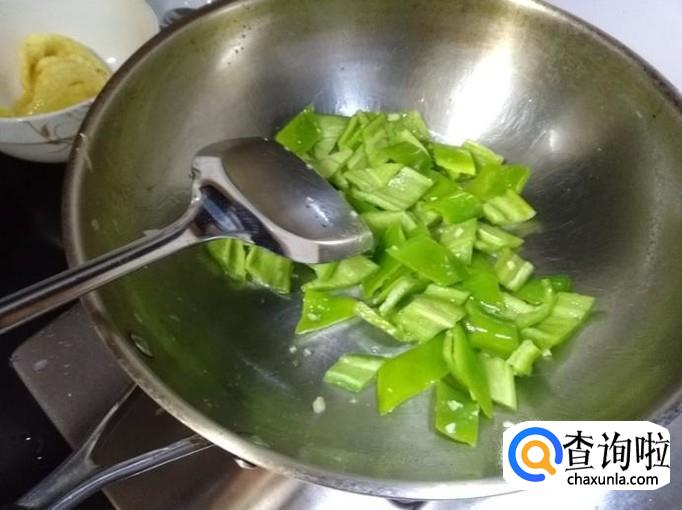 再倒入青椒,翻炒,待青椒变色;
