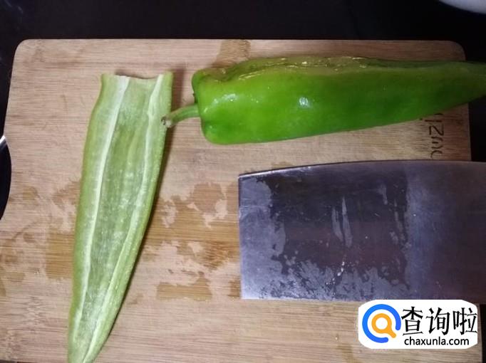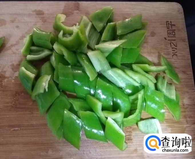 青椒去梗,分切两半,去籽,斜切成菱形,放盘备用;
