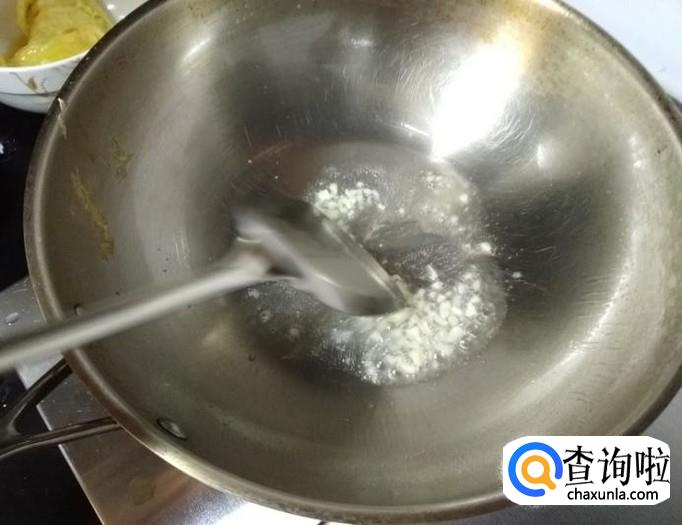 用煎蛋剩下的油,不够的话,可以再加点,中火,放入蒜末,炒香;