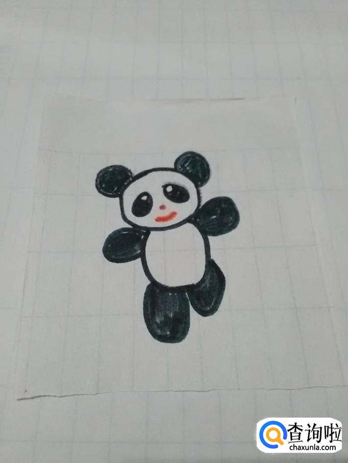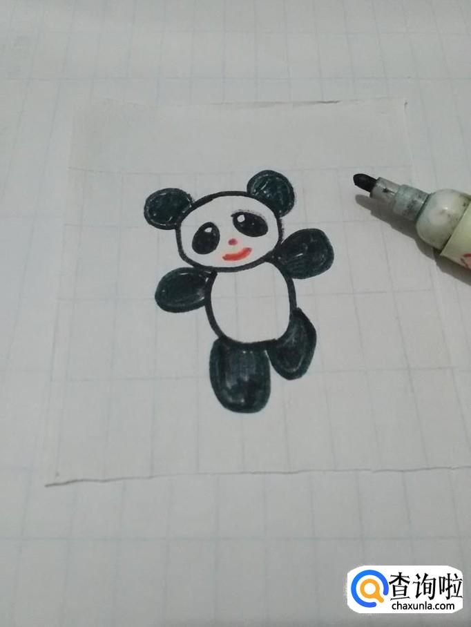 最后用黑笔将耳朵、眼睛、四肢涂成黑色,水彩熊猫就画完了。