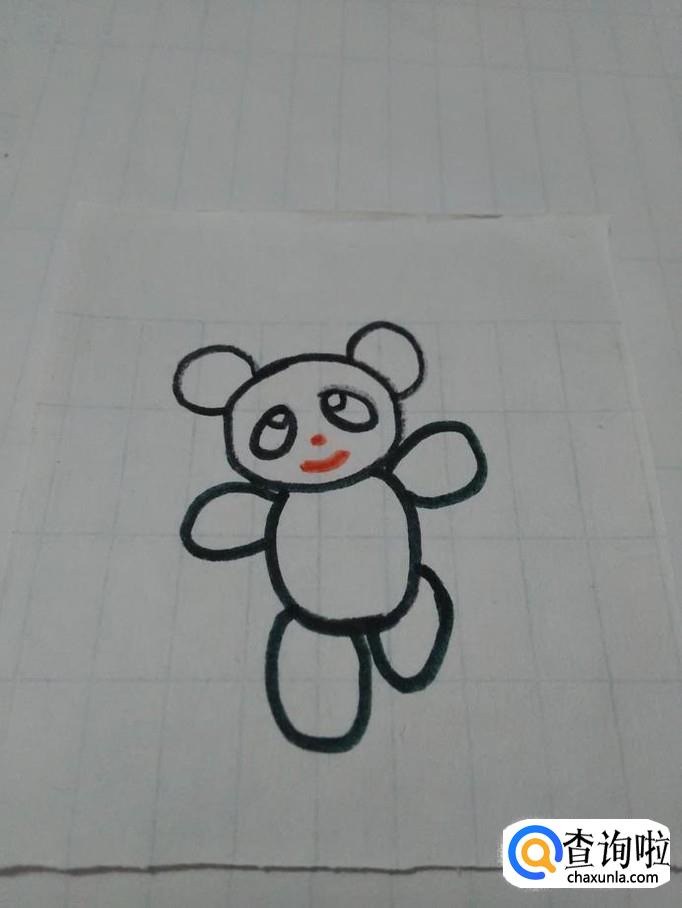 用红笔在眼睛下面点一个圆点,表示熊猫的鼻子,在鼻子下面画一条弧线,表示熊猫的嘴。