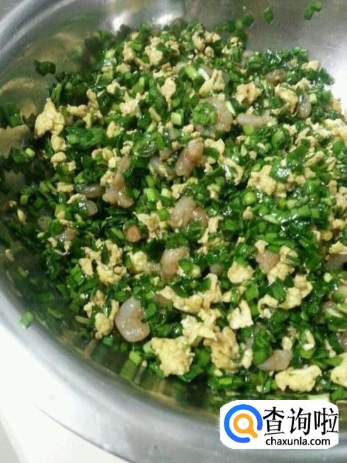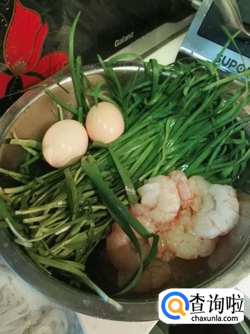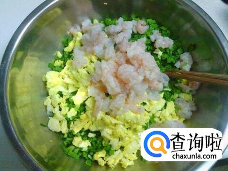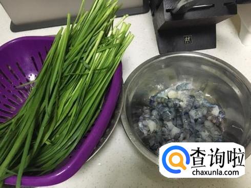 挑选上好的韭菜,洗净,放入一旁沥干水分,切成小段,放入盆中待用。然后,再将买来的上好鲜虾处理好,切成细丁。鸡蛋洗净,打碎于碗中,放置一旁,待用。