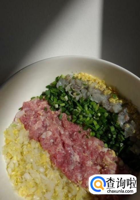 另起锅灶,锅烧热,放植物油,将油烧热,加入容器中备用的鲜虾,放入盐、调料,大火翻炒至五成熟左右,盛入容器中待用。之后将切好的韭菜、盘中的鸡蛋碎放入容器中炒制好的鲜虾之中,放入适量芝麻油、调料,调制成馅。