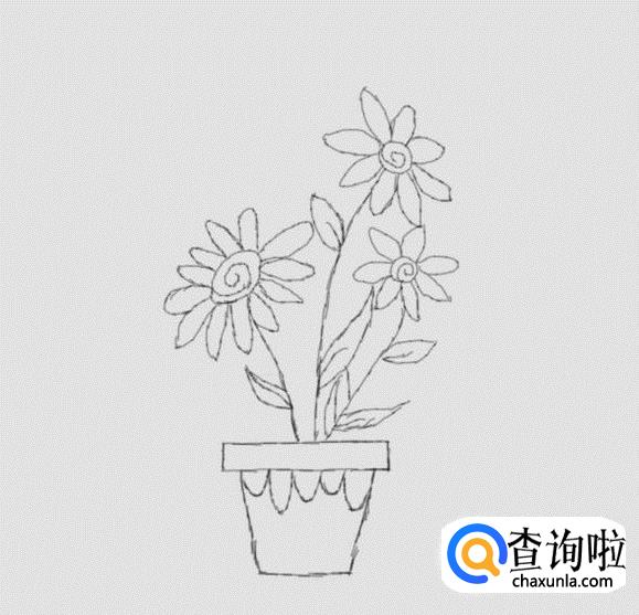 最后在枝干上分别画出花心和花瓣,这样我们的植物盆栽就画好了,如图所示: