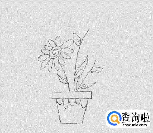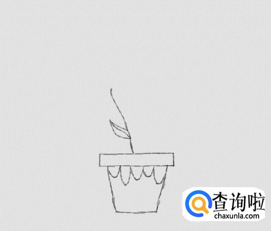 在花盆的上面画出一朵花的枝干,并在枝干上画出花叶,如图所示: