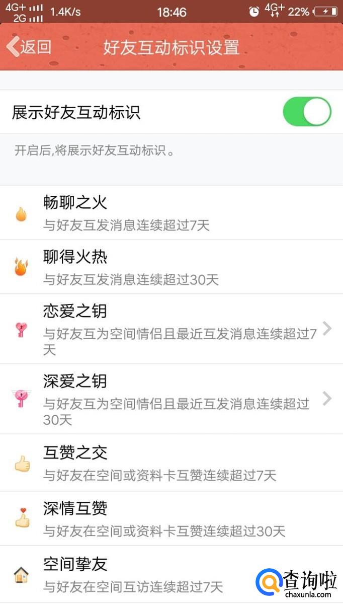 最后,再点击好友互动标识设置,根据自己的需求,点击开启关闭即可。