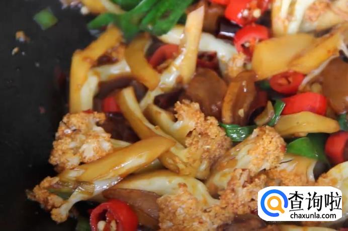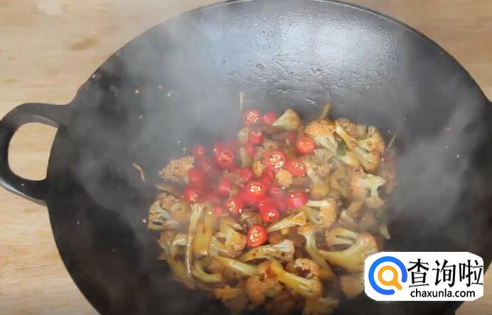 最后,再将切好的青蒜叶加入进去,一起翻炒均匀后即可出锅。这样,干锅花菜就完成了。