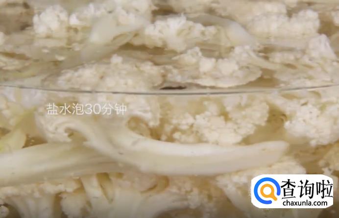 首先,将花菜洗干净之后,用刀切成小朵。装一碗清水,加一勺盐,搅匀后将切好的花菜放进去,浸泡30分钟。