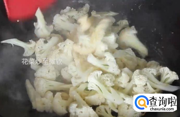 接着,锅里放入切好的姜丝、蒜、干辣椒、青蒜白,一起翻炒爆香。然后将花菜放进去,炒至微软。