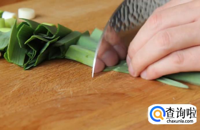 接着,将五花肉切成片,青蒜的蒜白部分切成小段,蒜叶切成长段,红辣椒和干辣椒切成段,姜切丝,大蒜拍碎,放在一旁待用。