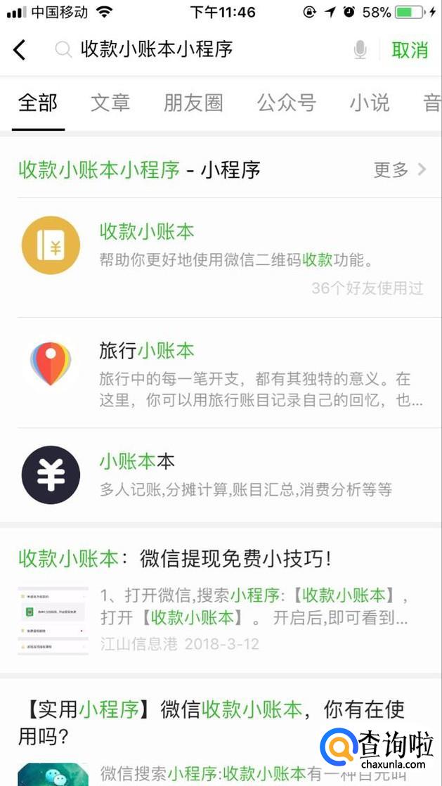 然后进入微信后,在最上面的搜索栏,搜索收款小账本,然后点击进入。