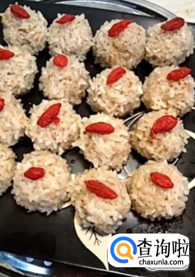 第五道菜是珍珠丸子,肉丸子外面裹一层糯米,香糯可口,非常美味哦!做好以后在上面放上一颗枸杞做点缀,非常的好看哦!