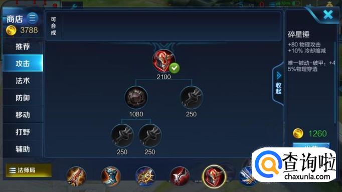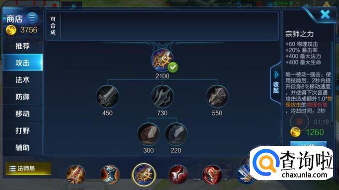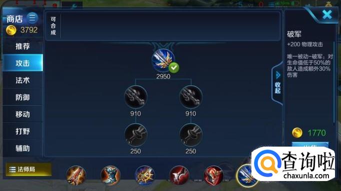 中后期出装:宗师之力,泣血之刃,碎星锤,破军。宗师之力提供20%暴击几率,加上铭文就有70%左右的暴击率,并且宗师之力的被动会增加额外100%的物理伤害,出完这件装备和泣血之刃后两个技能带走一个射手是件很轻松的事情。碎星锤主要增加物理穿透,配合破军的高额物理加成可以打灭对面的坦克。