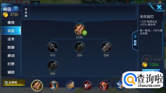 前期出装:攻速鞋,无尽之刃,吸血之镰。攻速鞋改版之后会增加30%的攻击速度,并且只要710g金币,是一件性价比很高的装备,无尽之刃增加暴击率和暴击效果,同时也是2100价位里面唯一增加120点物理攻击的装备,增加输出。吸血之镰价格便宜,可以增加少量的吸血率。