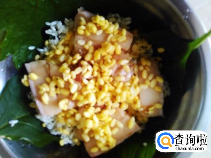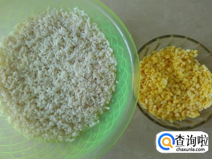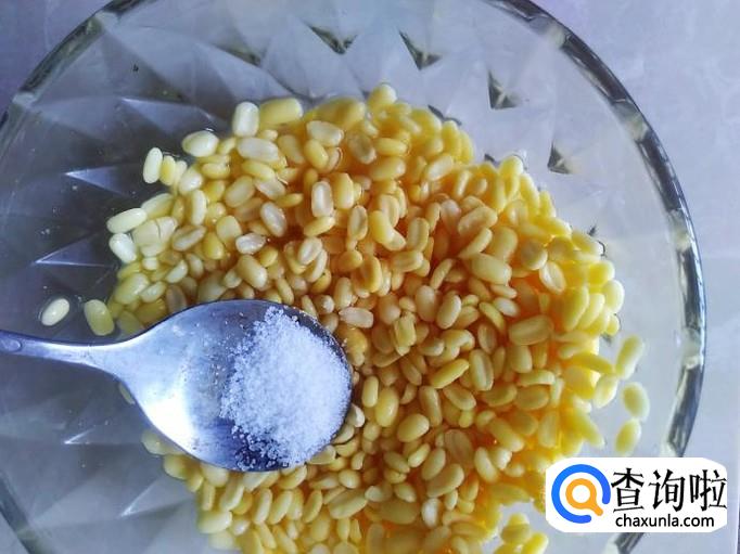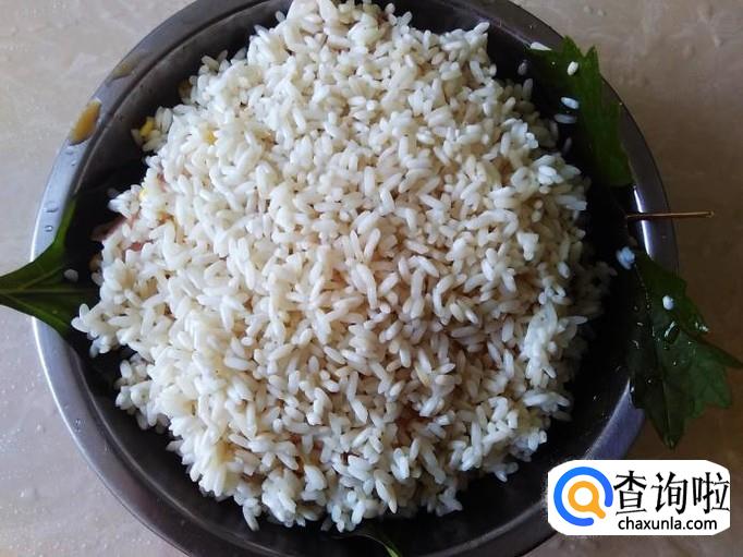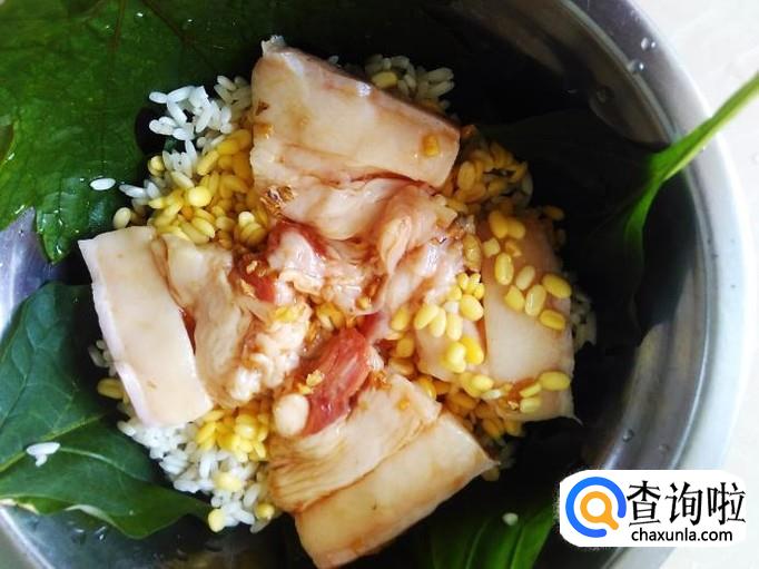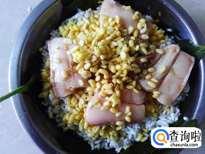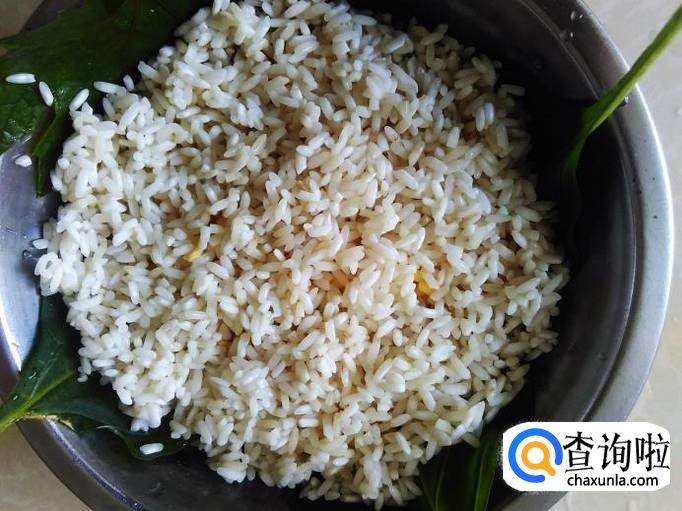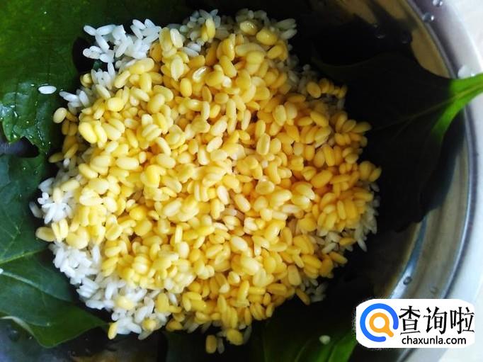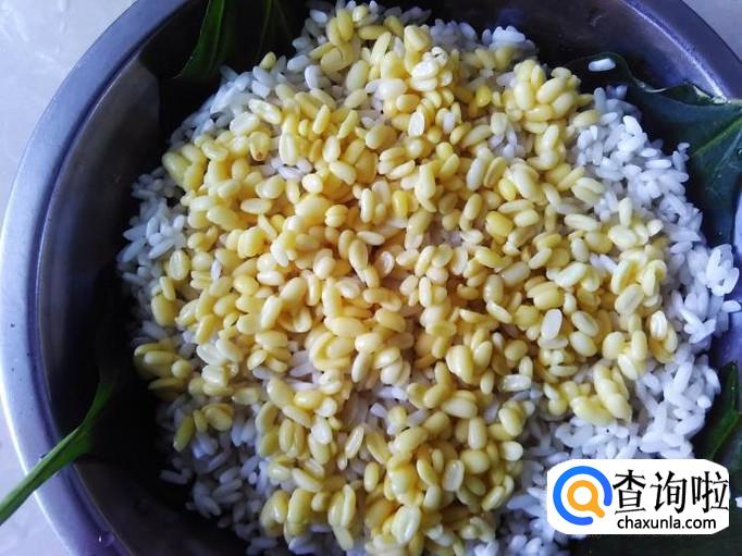 糯米和去皮的绿豆泡水一个晚上,然后捞起来,糯米和绿豆都加适量的盐搅拌均匀。