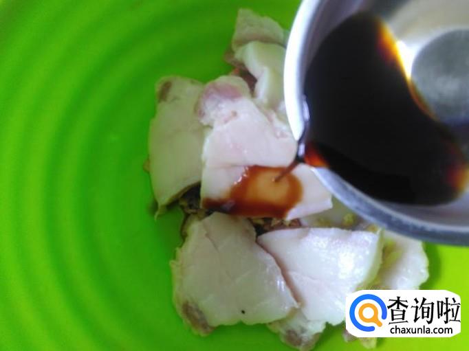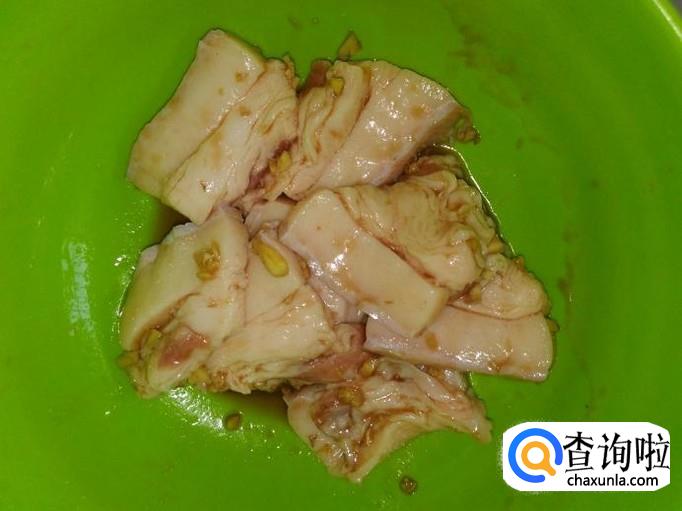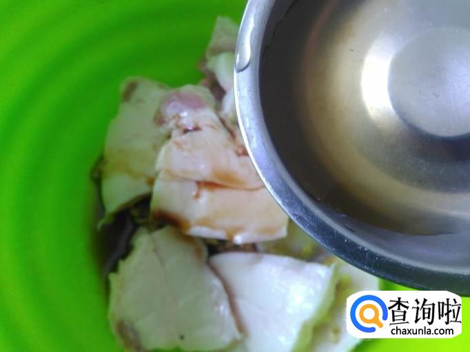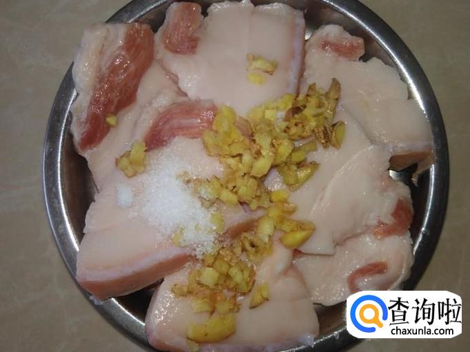 猪肉切成片,加适量的盐、姜蓉。【猪肉要选择肥肉多的,蒸的时候出油,绿豆和糯米吸收,糕点才变得油滑好吃】