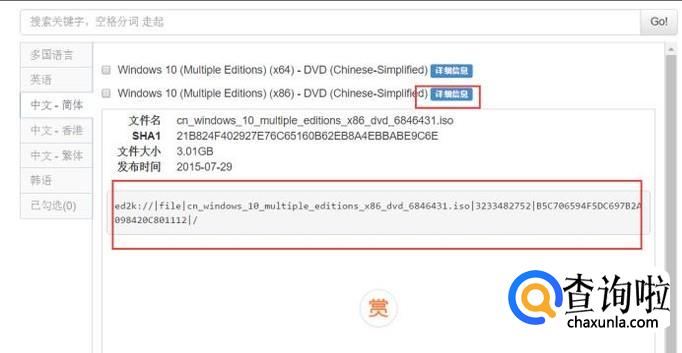 选择好需要下载的系统文件之后,点击页面中的“详细信息”按钮,在展开的菜单中,复制文件下载链接。