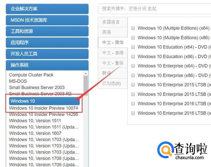 点击选择需要下载的系统类型及版本号,并在右侧选择系统语言类型及系统位数。