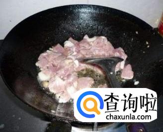 锅中加油,油8分热时加入猪肉爆炒,然后加葱姜蒜翻炒。