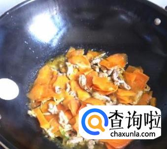 最后我们加入胡萝卜片,翻炒至胡萝卜片8分熟,加盐,味精,花椒面少许,炒匀,起锅