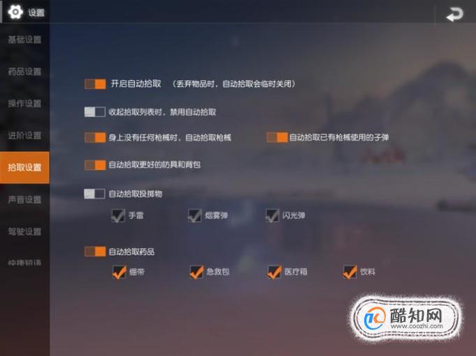 然后我们选择“拾取设置”可以看到“开启自动拾取”这个选项,点击选择即可,如图所示,还可以设置哪些东西自动拾取。