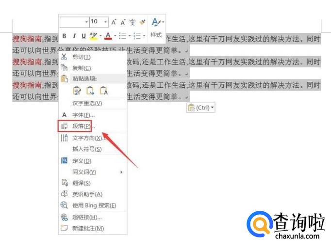 选择刚刚输入的文字,然后单击鼠标右键在弹出的右键菜单里找到段落选项,如图所示: