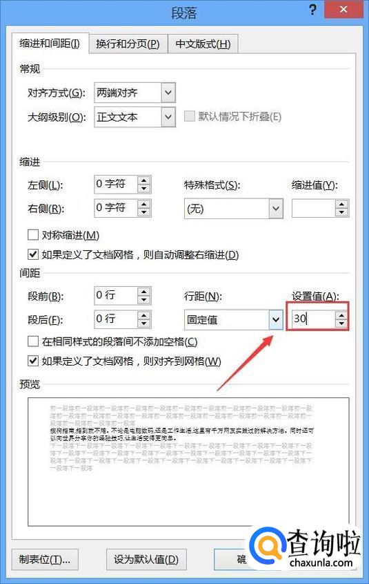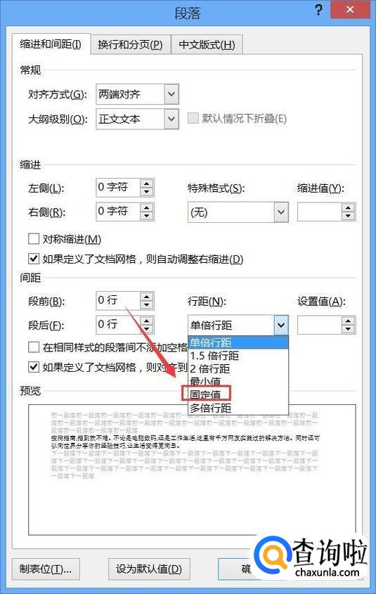 点击段落选项在弹出的对话框内我们找到行距选项,点击该选项在其下拉菜单那里找到固定值选项,如图所示: