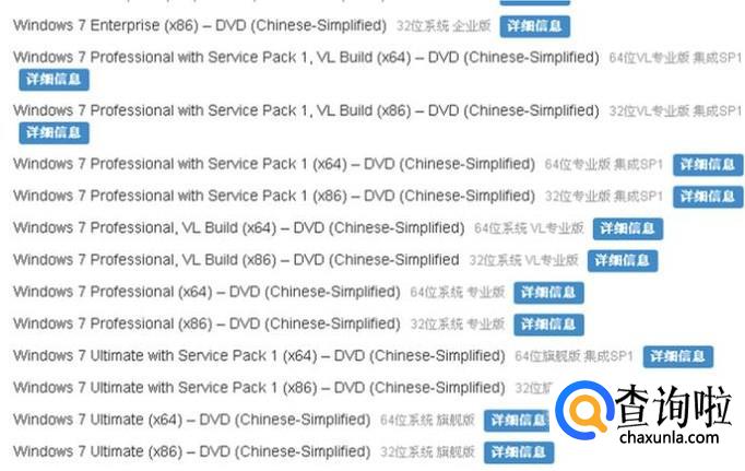 然后在右边找到你需要下载的win7版本,比如我要下载win7 64位旗舰版,就点win7 64位旗舰版右边的“详细信息”。