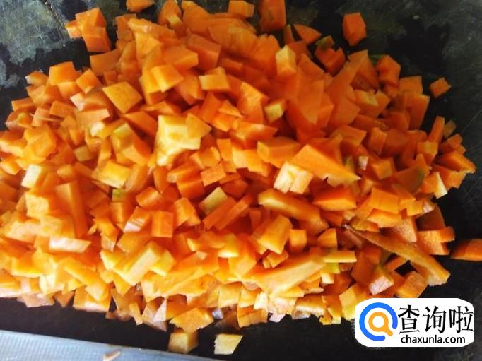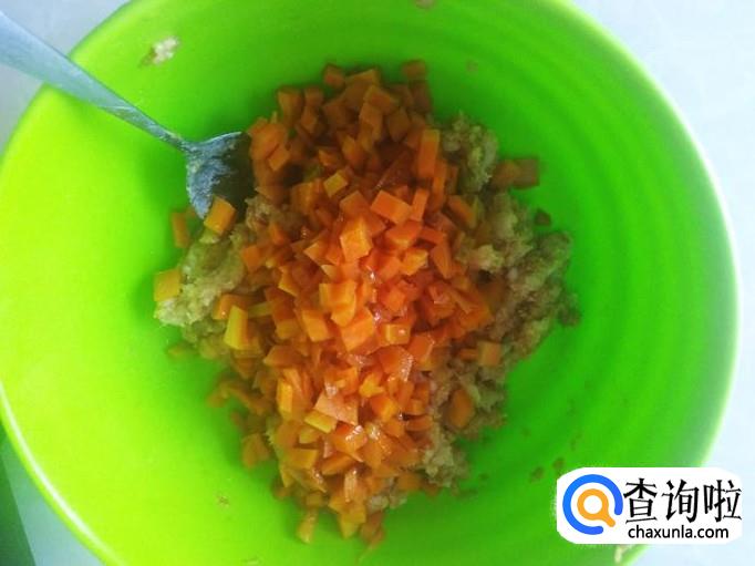把猪肉剁成肉饼,红萝卜切成小丁。