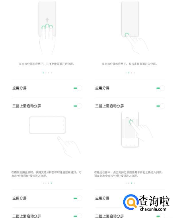 oppoReno Ace有四种分屏方式,分别是:三指划屏、长按多任务、点击任务卡片右上角、以及横屏时收到信息通知分屏回复。按照图片提示进行分屏