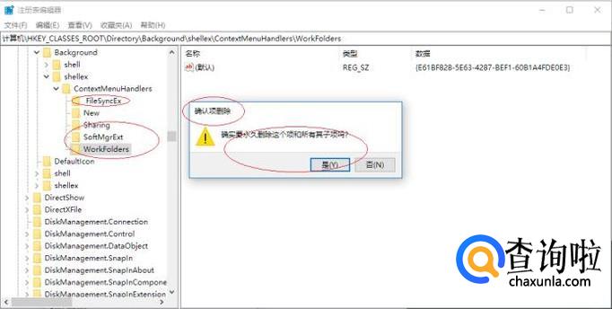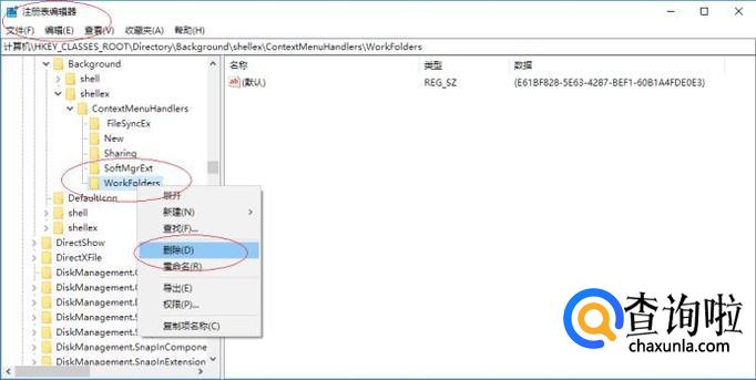 鼠标右击"WorkFolders"文件夹,弹出快捷菜单选择"删除"项。
