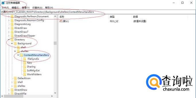 依次展开文件夹,定位"HKEY_CLASSES_ROOTDirectoryBackgroundshellexContextMenuHandlers"注册表项。