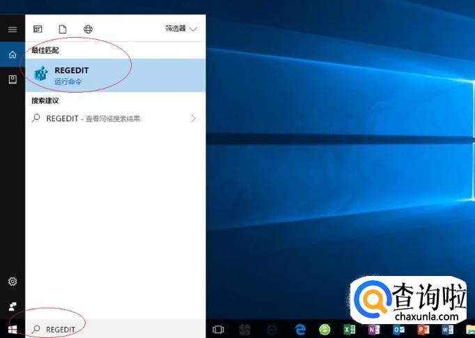 搜索框输入"REGEDIT",选择最佳匹配"REGEDIT 运行命令"项。