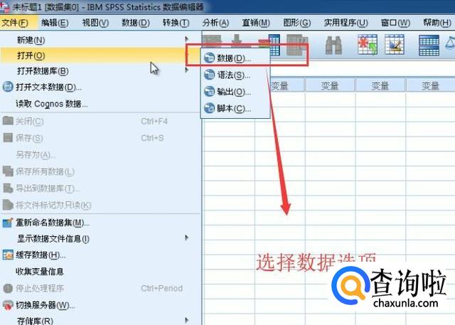 首先我们点击左上角的文件菜单,点击打开菜单下面的数据选项,如下图所示