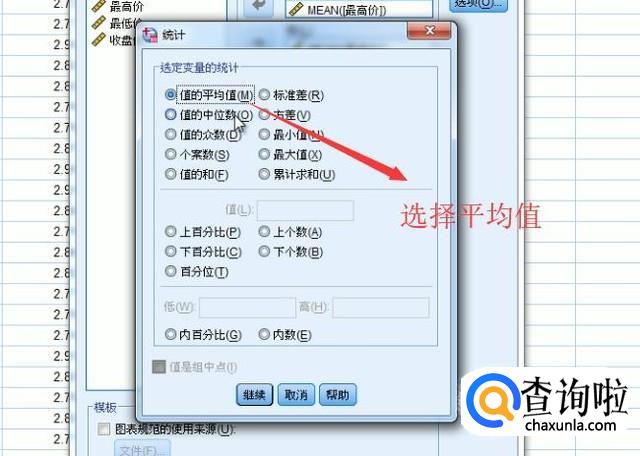 然后在弹出的统计界面中我们选择平均值选项,如下图所示