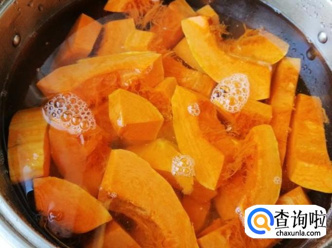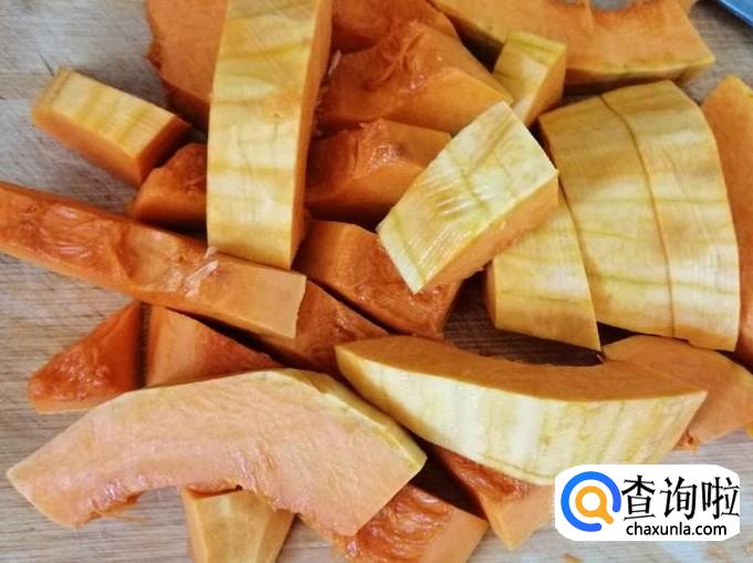 把去籽的南瓜用刮刀去皮,处理完南瓜皮后,切成南瓜块,南瓜块大小根据自己喜欢切,用来煮粥切大点也没关系,切好放入锅内待用。