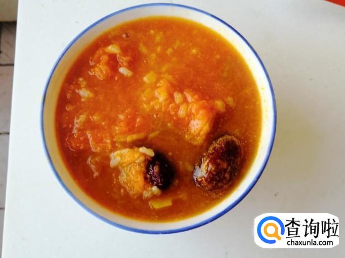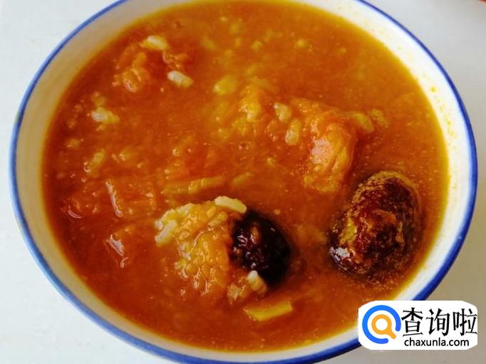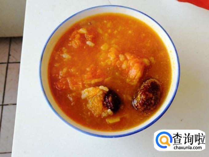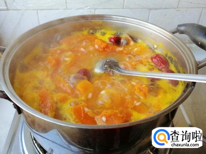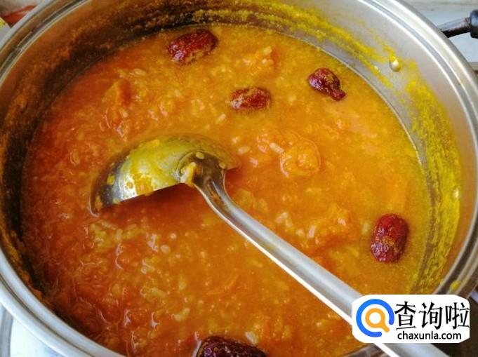 整个煮粥过程中,时不时过来查看和用勺子搅拌一下,以免糊锅或溢锅,大约二十分钟后,南瓜已软,糯米和红枣都煮好了,这样我们的香甜南瓜糯米粥已做好,关火就可以了。